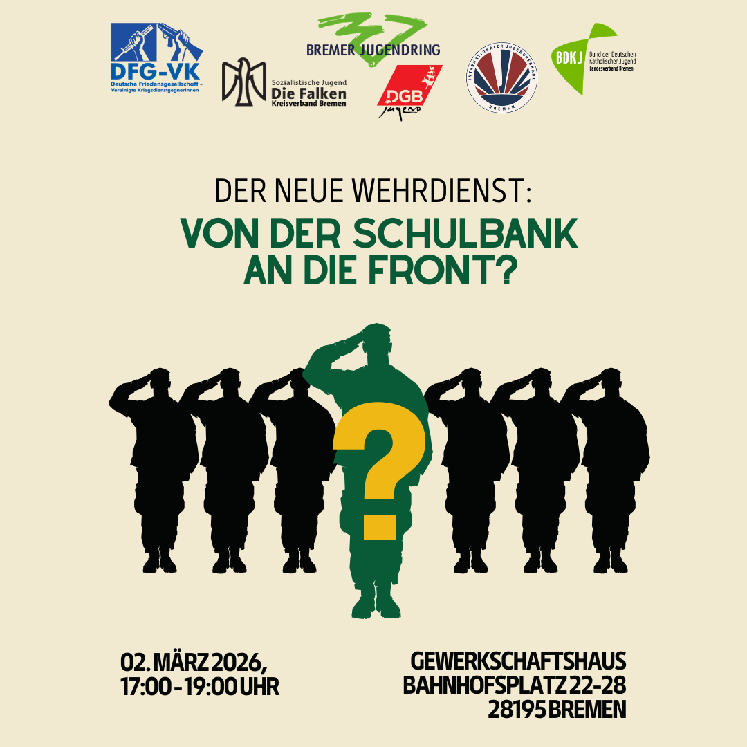Anlässlich des Schulstreiks gegen die Wehrpflicht am 05.03. laden wir zu der Auftaktveranstaltung unserer geplanten Veranstaltungsreihe zum Neuen Wehrdienst ein.